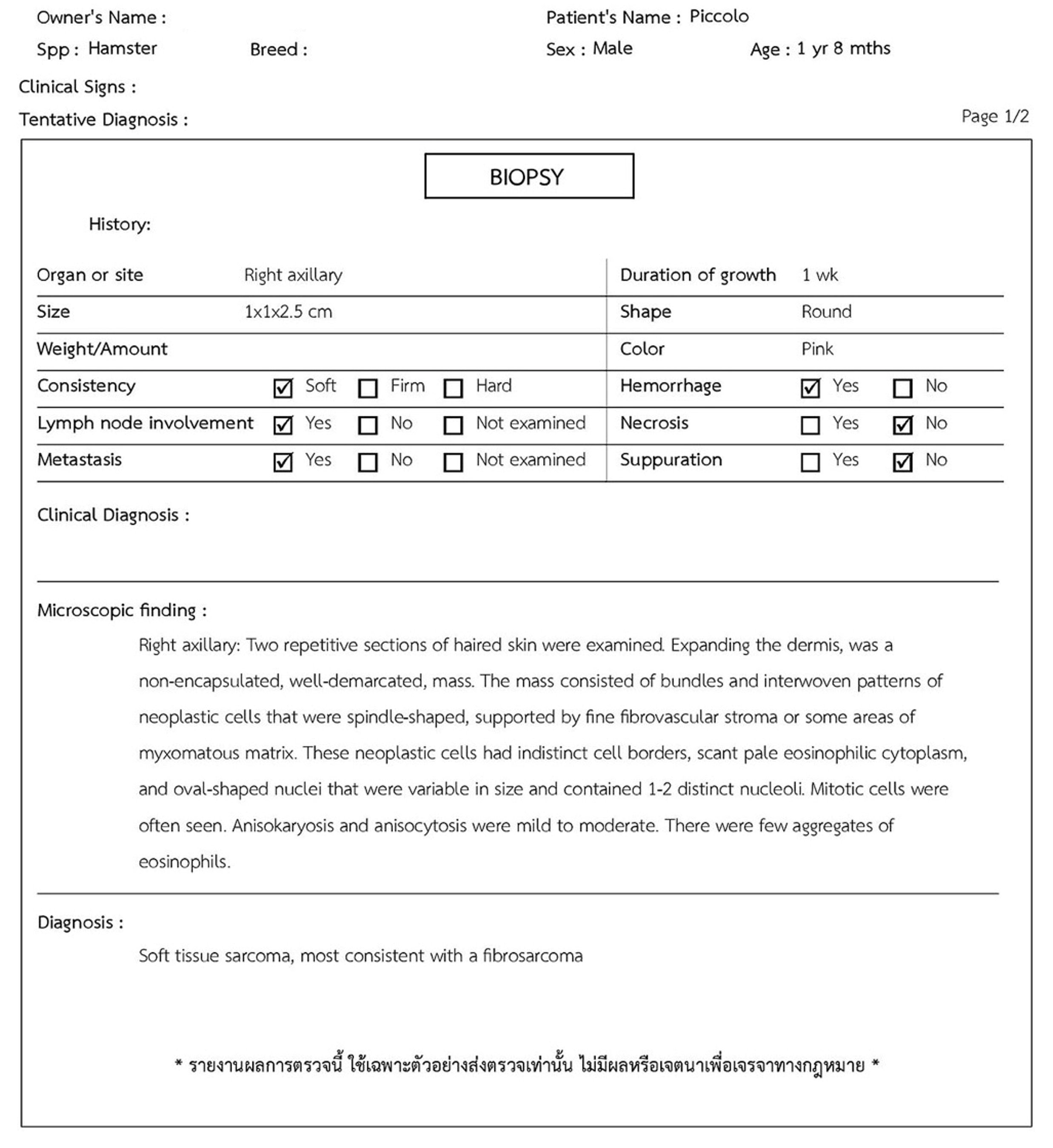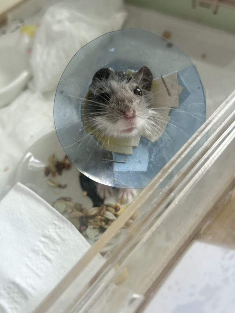 Picco’s biopsy results came back earlier than expected, but sadly confirmed malignancy. His diagnosis was fibrosarcoma, or cancer of the soft tissues. It wasn’t common in hamsters, but it was operable — if more tumors develop, our doctor could surgically remove them again.