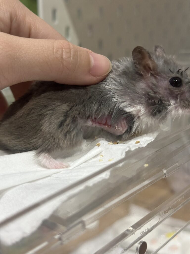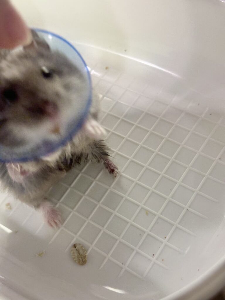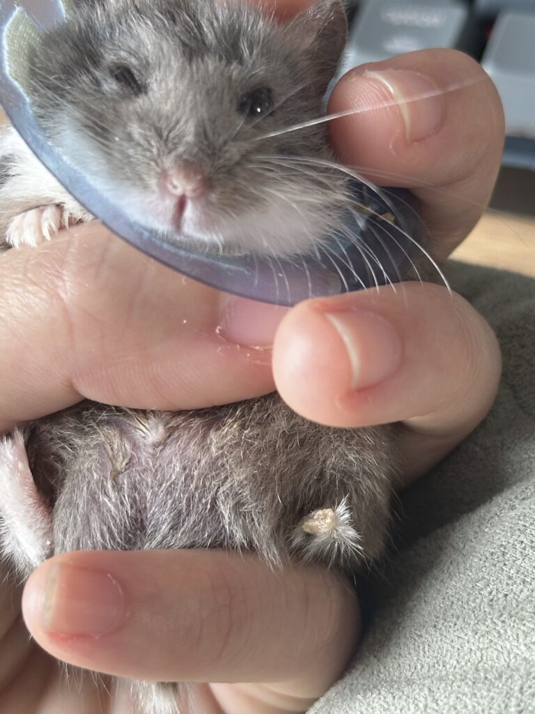 The vet explained that Picco probably cut it further from scratching at the cone and recommended to 1) keep spraying at home, and 2) find a softer cone for him to wear (though she didn’t know where I could find one for hamsters either, as most cones are too big).