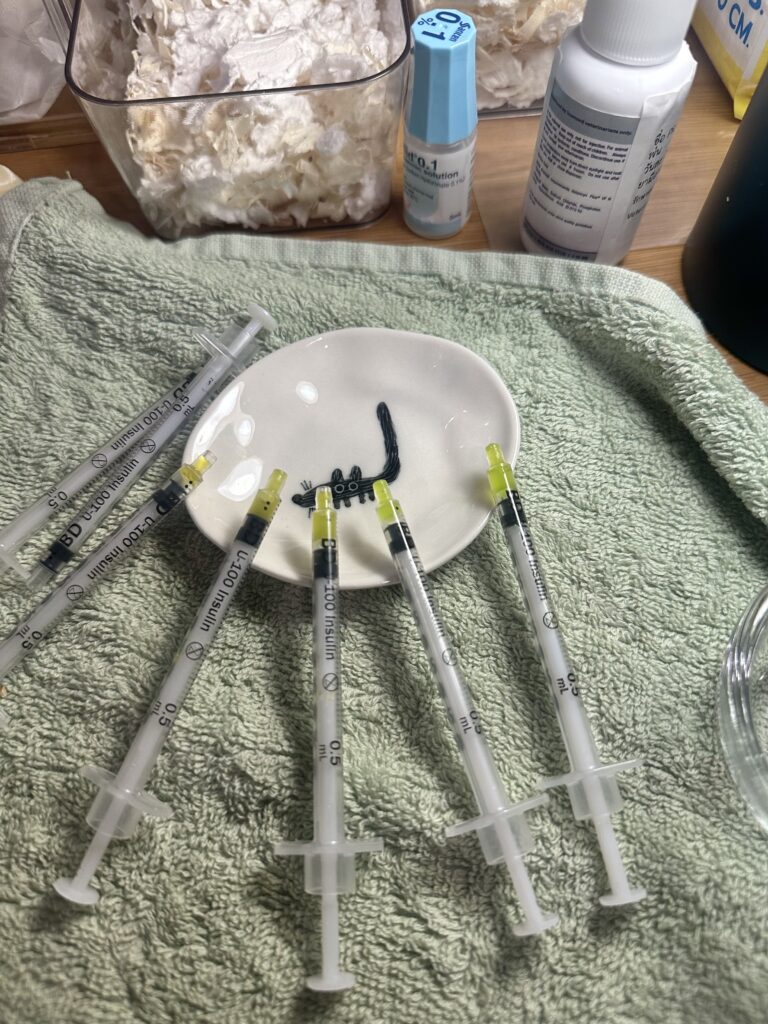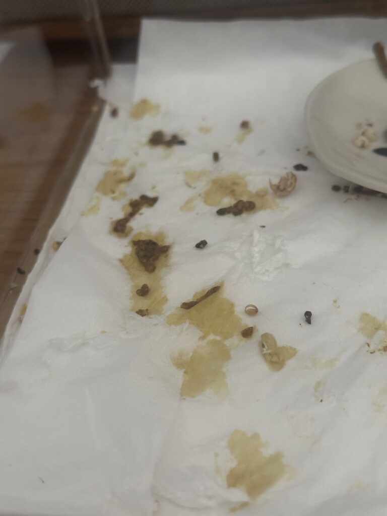 I woke up to watery diarrhea again 3 days later, which looked worse than the first time. We went back to the vet, who determined that our current antibiotics were sufficient given Picco was already on a lot — 3 cancer meds, 2 antibiotics, the probiotics, a medicinal spray and eye drops. She did suggest to take the probiotics at a different time than antibiotics so the beneficial bacteria isn’t destroyed (something we weren’t told last time by another vet), and to strongly disinfect his cage with alcohol to prevent any contamination.