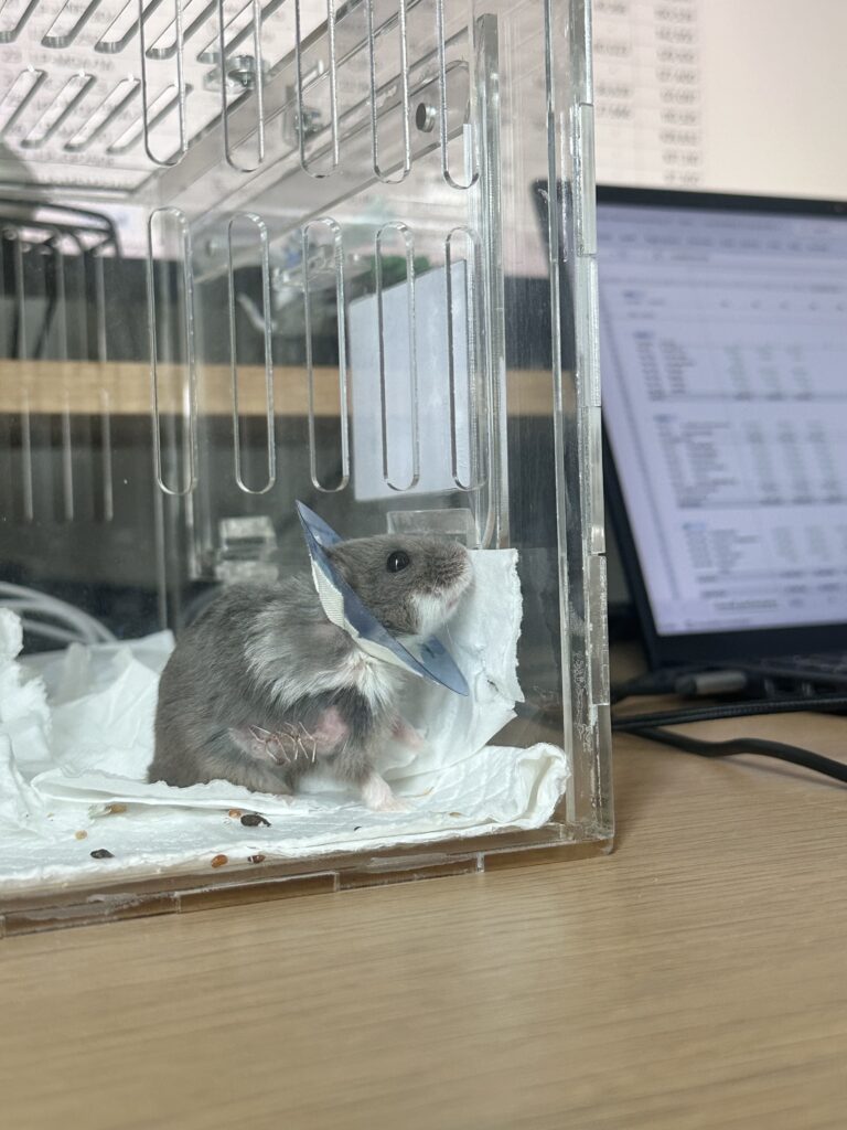 Fun fact — a nurse actually told us this was the largest cone they’d ever given a hamster. /Just Picco (sadly) making history