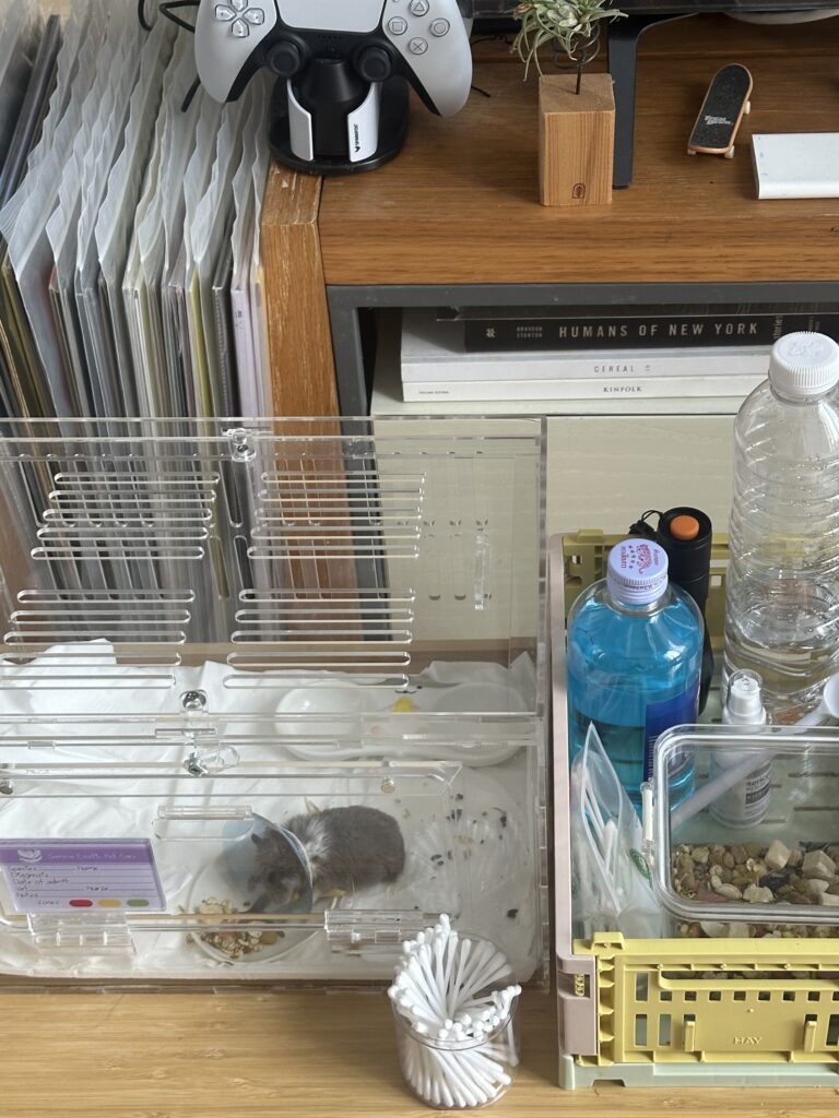 I took Picco home after surgery with a cone on, a new recovery cage to limit his movements, and two antibiotics to take over the next 7 days. We also received eye drops, as the cone would make it difficult for Picco to fully close his eyes and might dry them out. I was told to monitor his wound in case it reopened, but that ‘overgrooming’ was normal and to be expected.